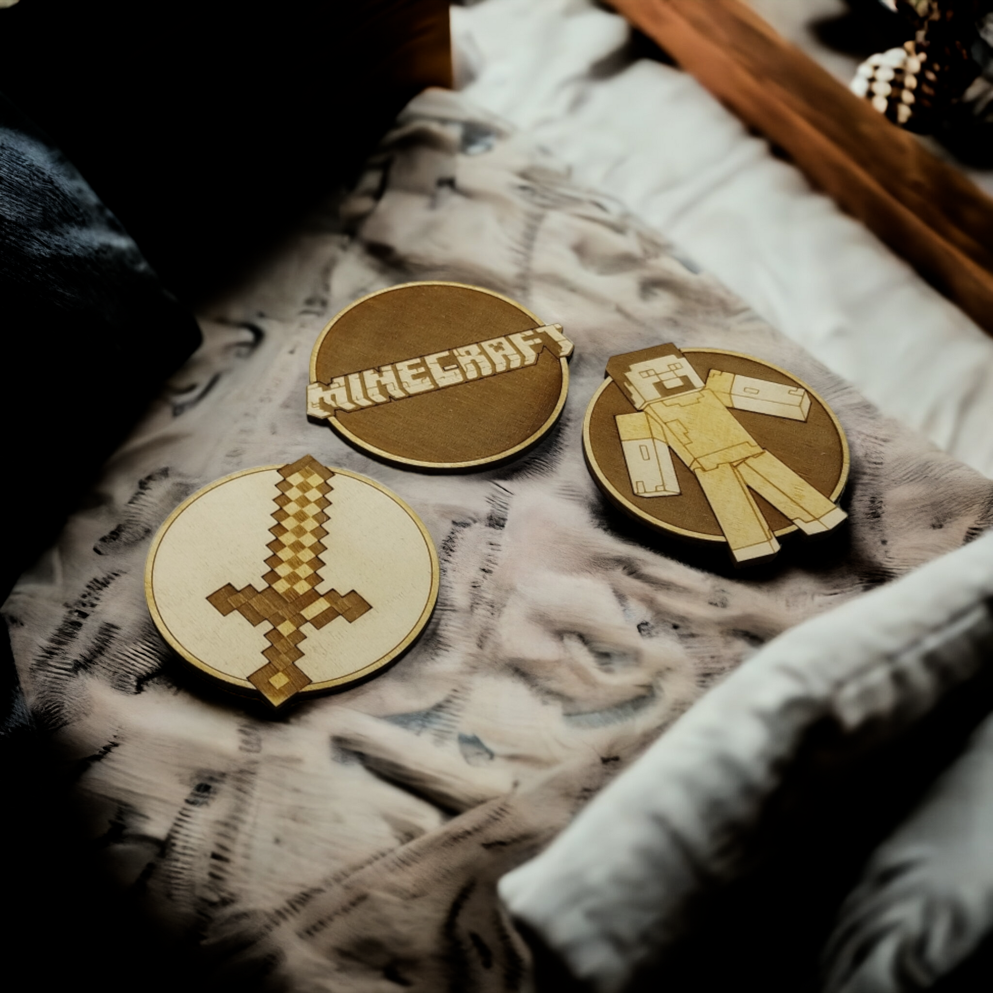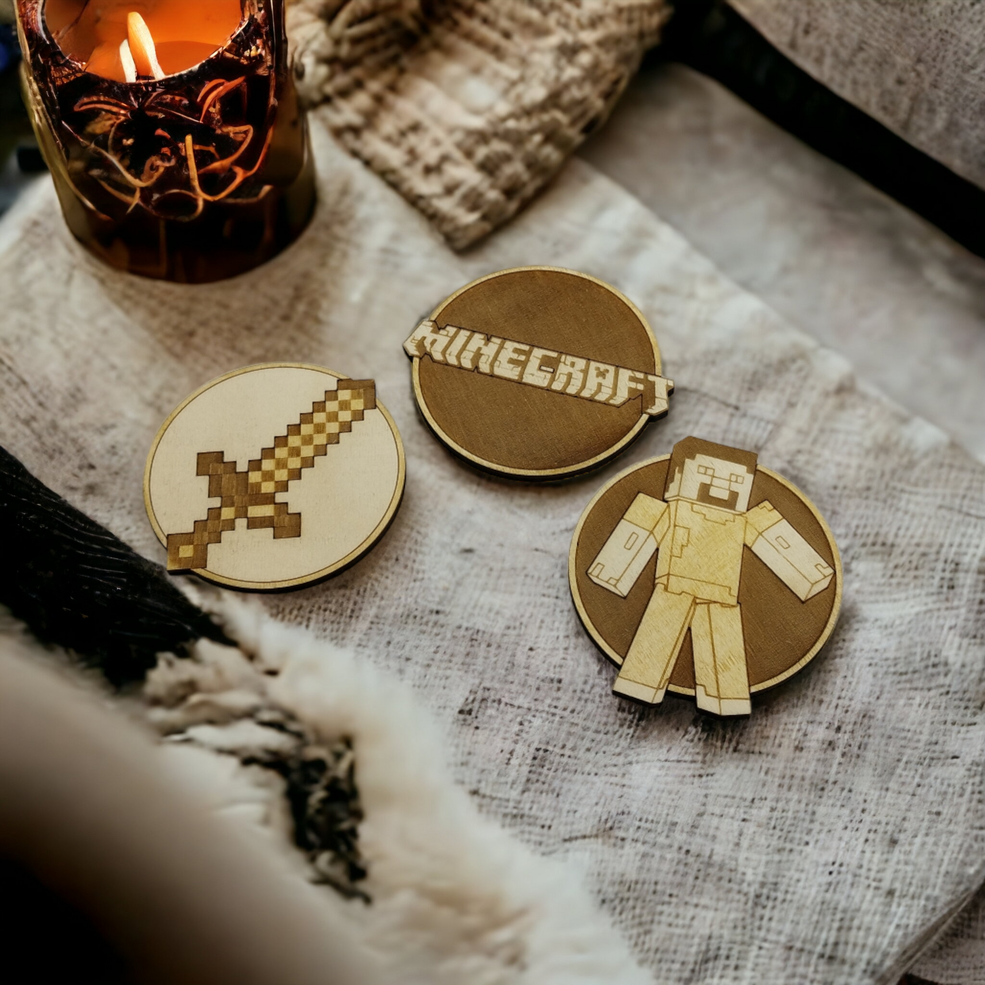 Set of 3 Minecraft Wooden Coasters - Handmade Gift - Housewarming - Wood Kitchenware - Gamer